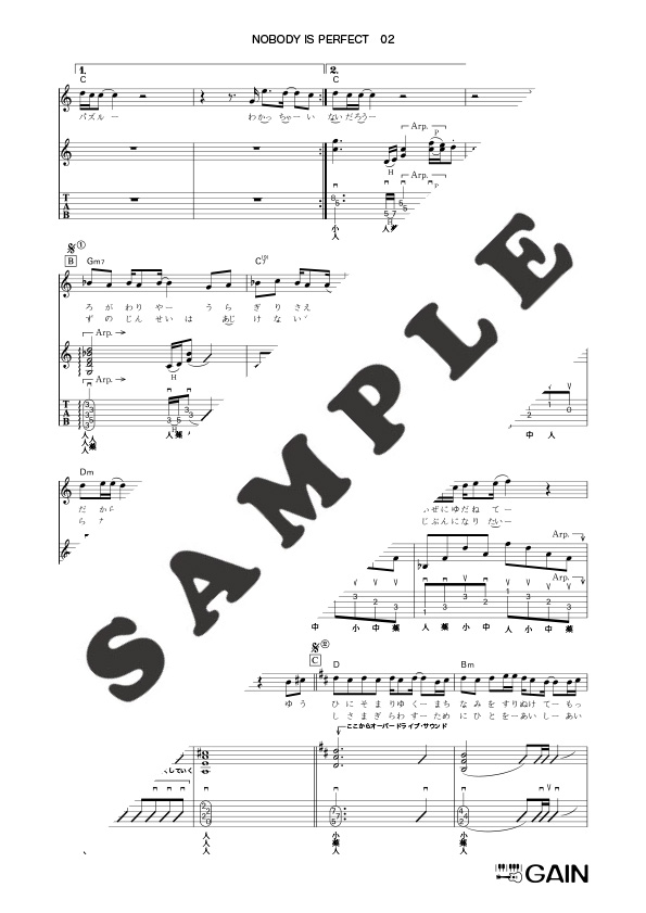 | 指弾きアルペジオで曲を伴奏してください。ボーカルを加えればコブクロのなった気分が味わえるはずです。途中の変拍子や転調が練習ポイント。演奏+解説動画はYouTubeにて公開中です | ||